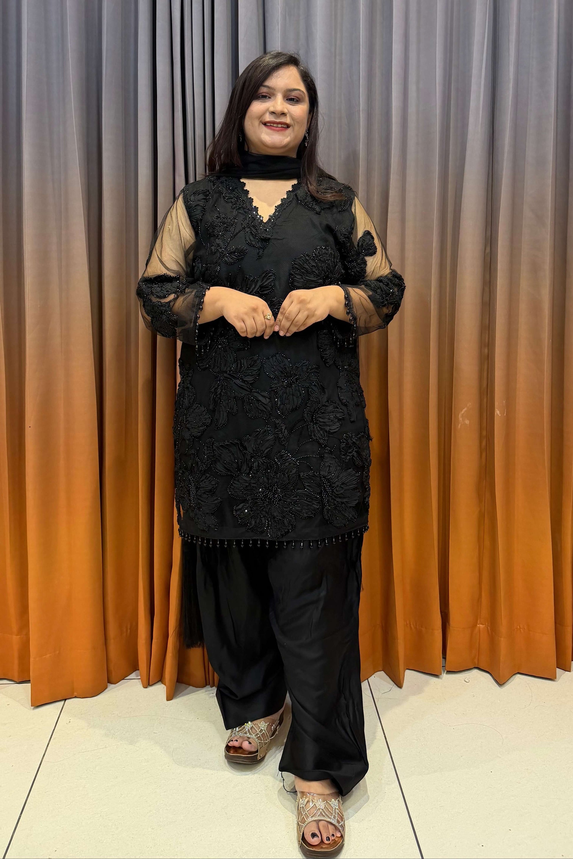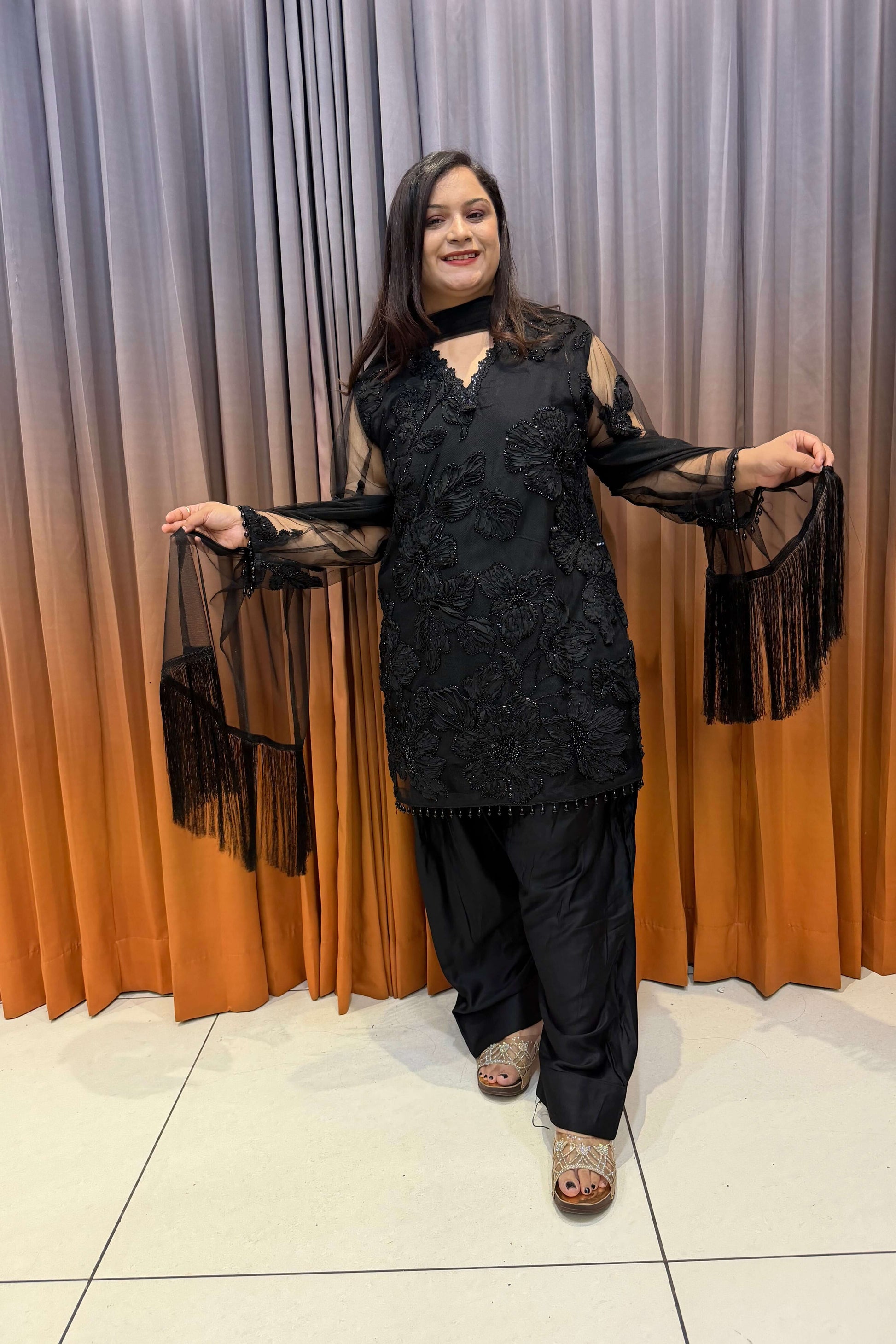 A stunning black appliqué suit featuring detailed floral work, sheer sleeves, and a graceful dupatta. Perfect for festive evenings, elegant parties, and statement occasions with a premium refined finish.
