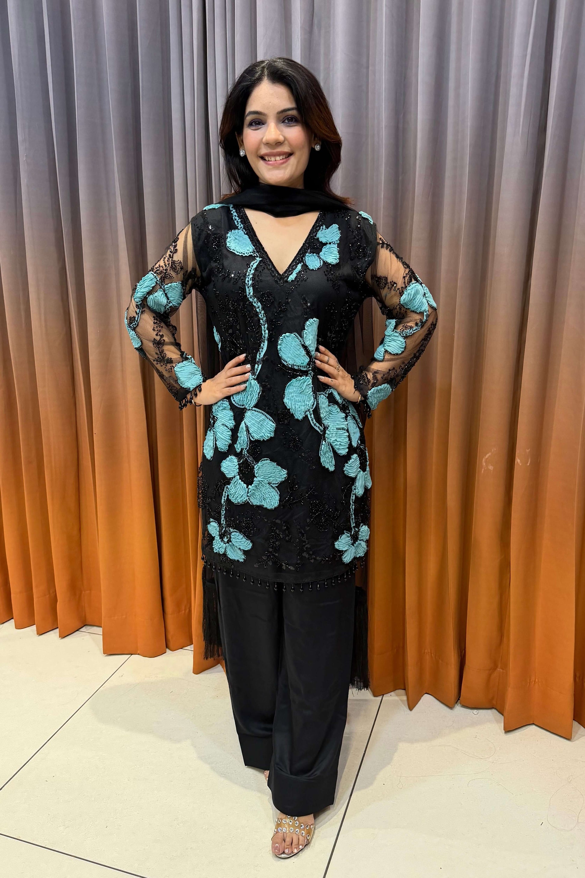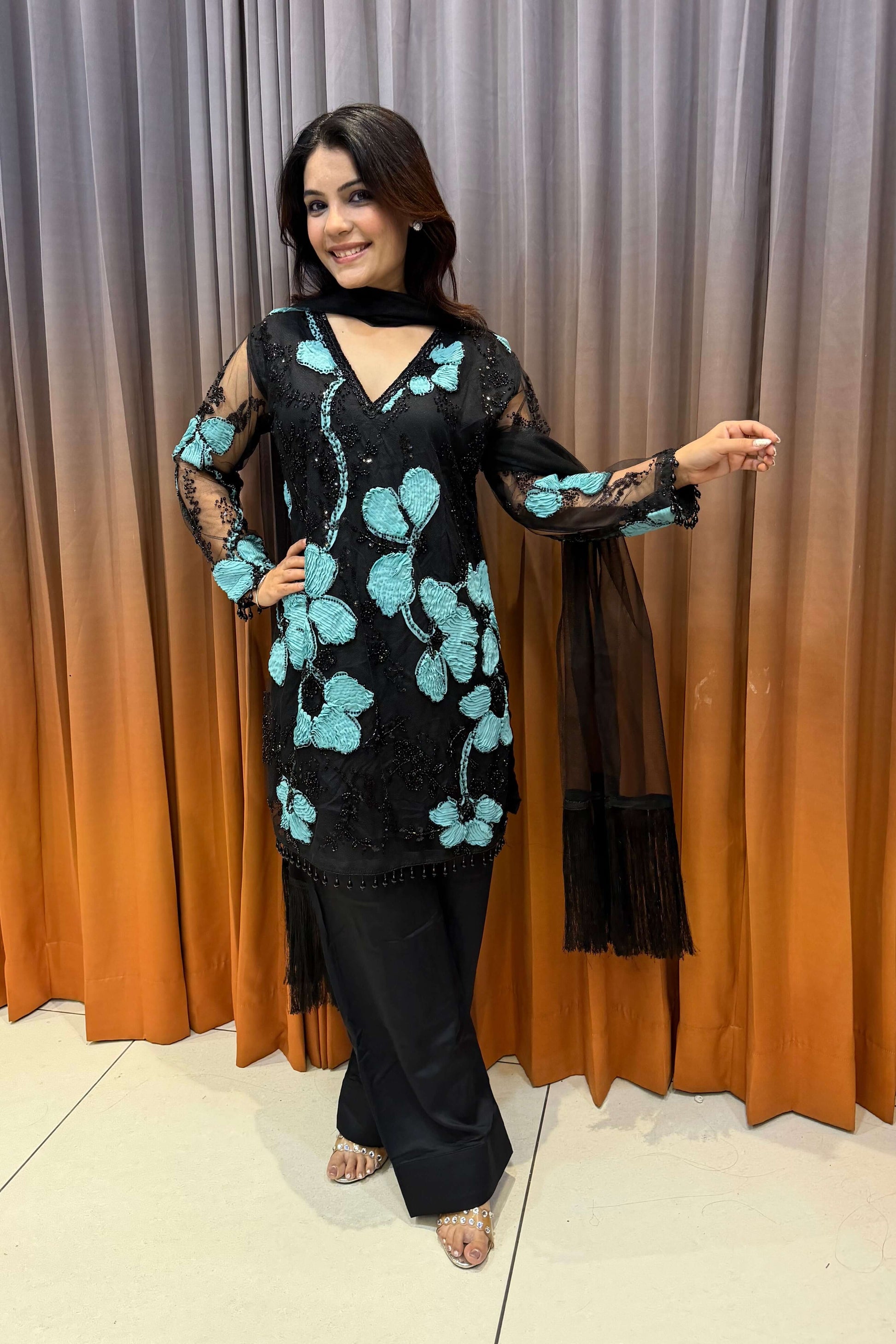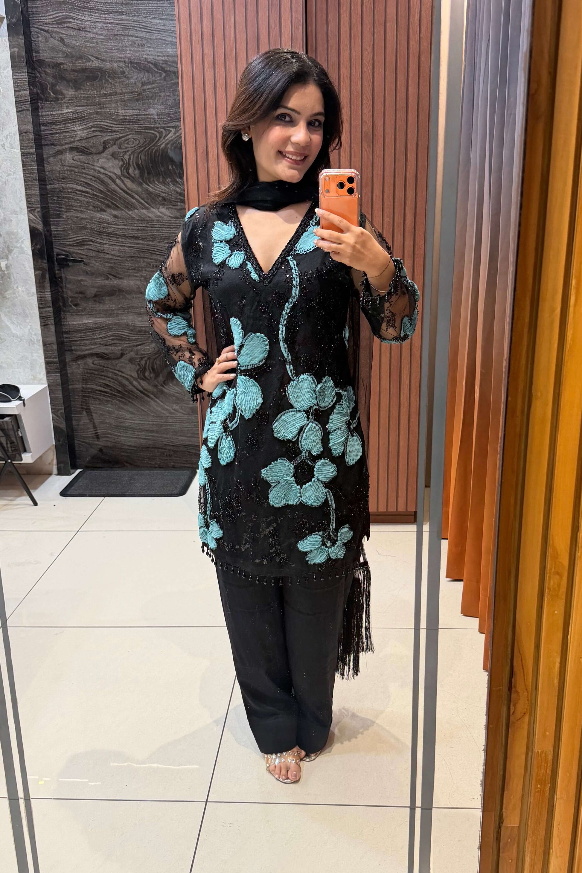 A chic black suit adorned with bold firozi appliqué florals, sheer embroidered sleeves, and a sleek dupatta. Perfect for festive nights, parties, and elegant celebrations with a modern touch.