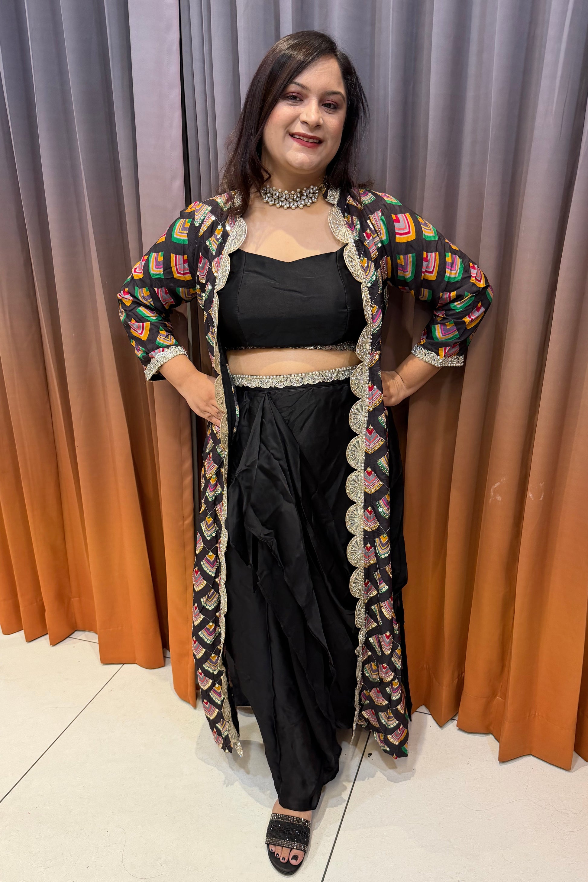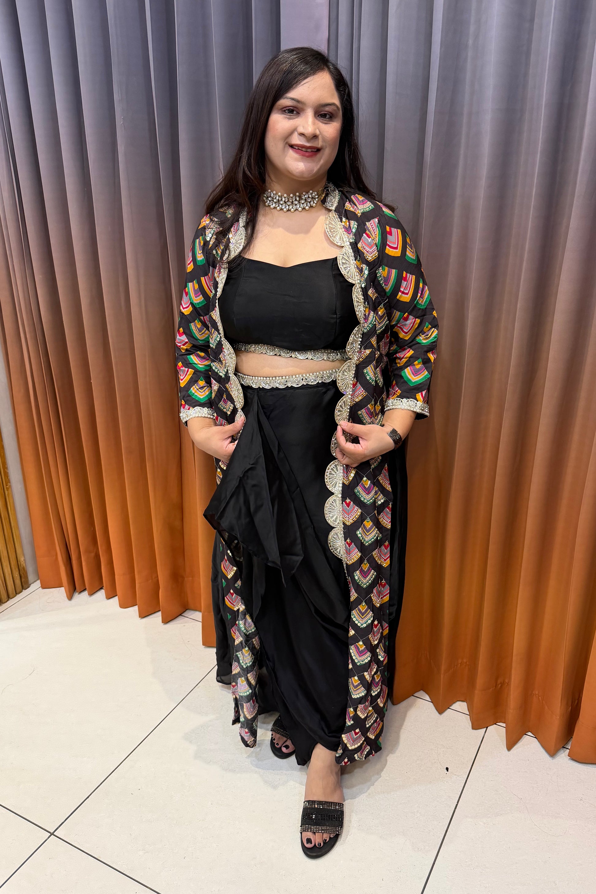 A stylish black drape dress paired with a vibrant embroidered jacket, blending modern silhouettes with festive detailing. Perfect for parties and celebrations, offering elegance, comfort, and effortless Indo-fusion charm.