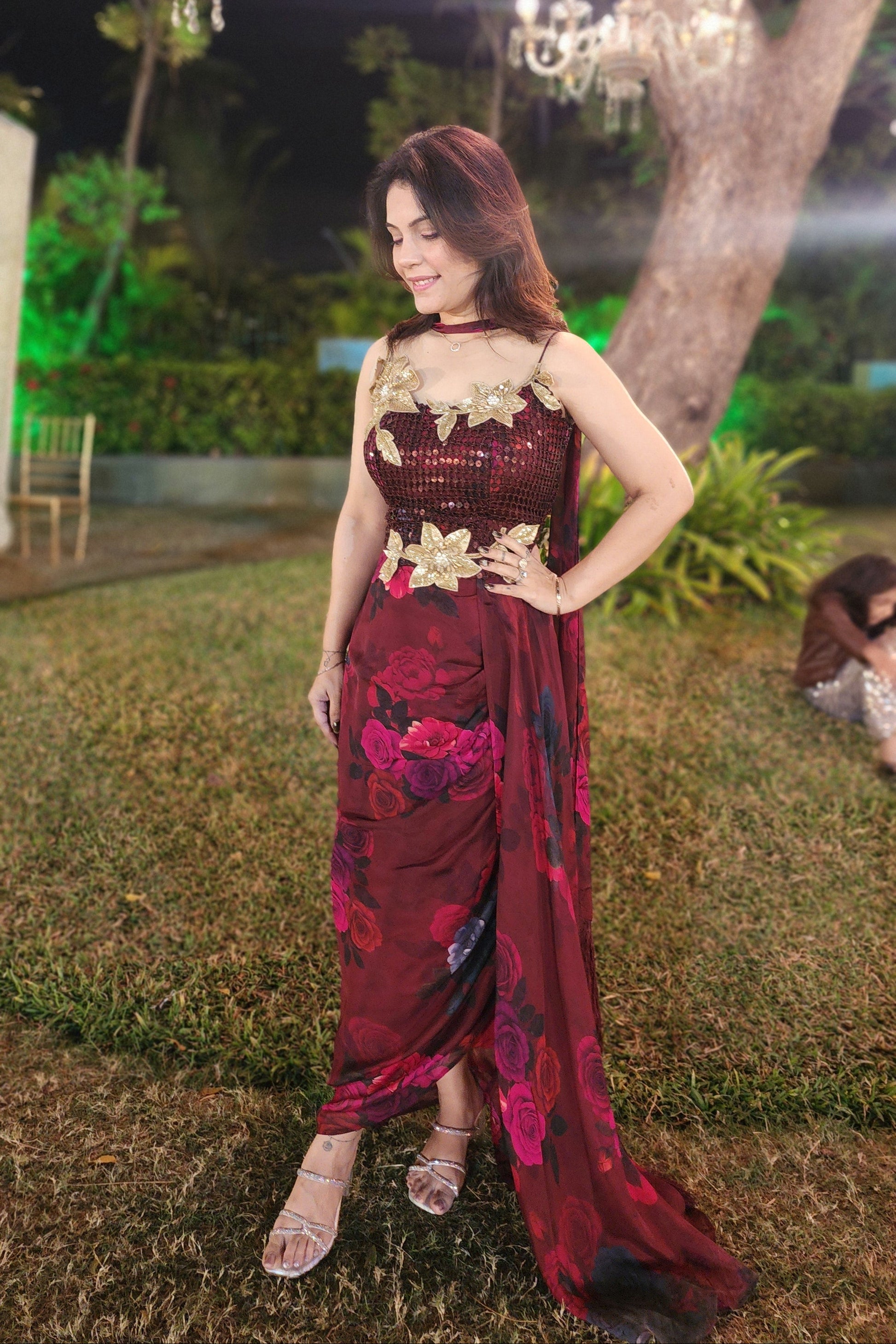 Drape & Glow in this exquisite floral saree, where rich hues, delicate sequins, and graceful draping come together to create a timeless evening look of effortless elegance.