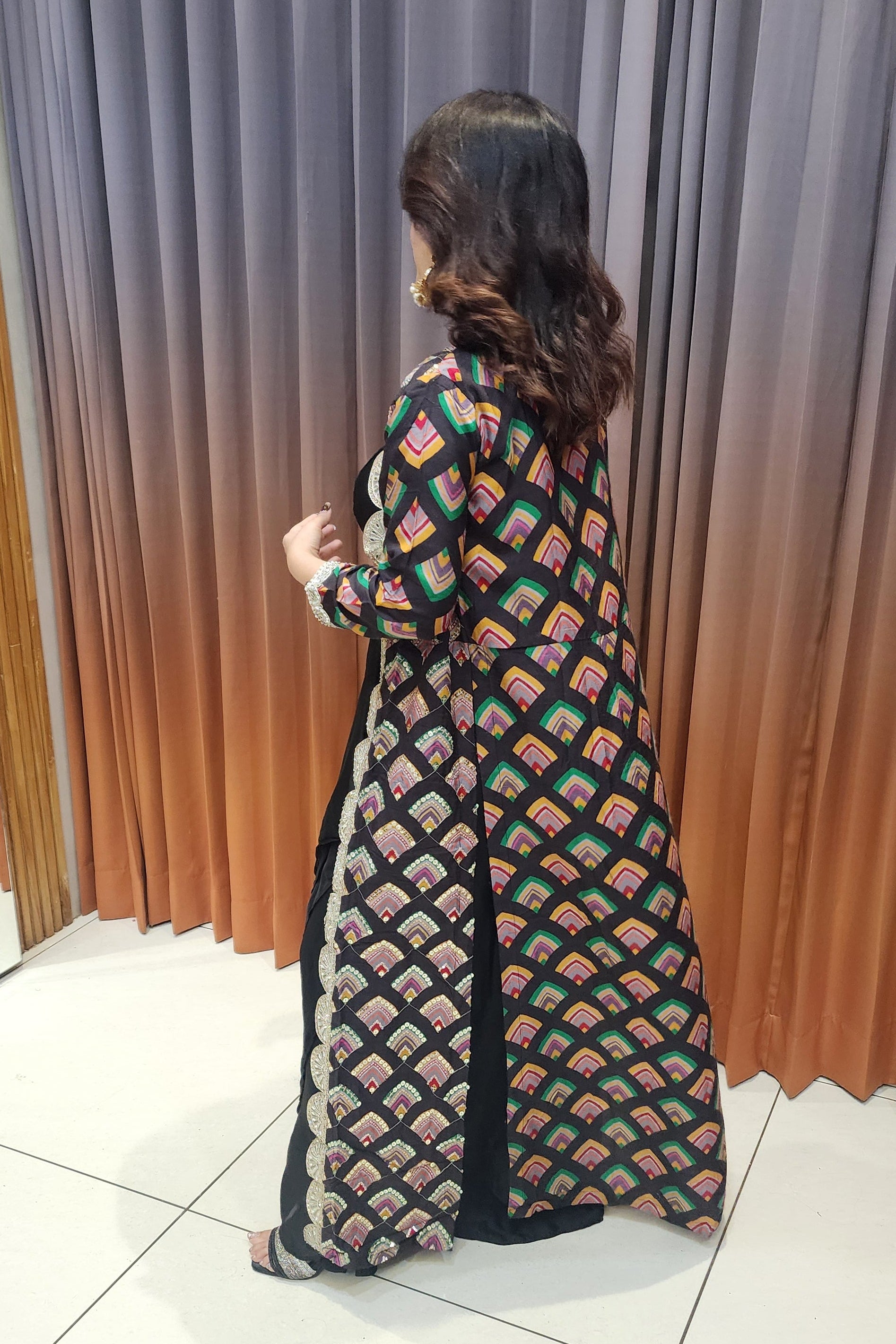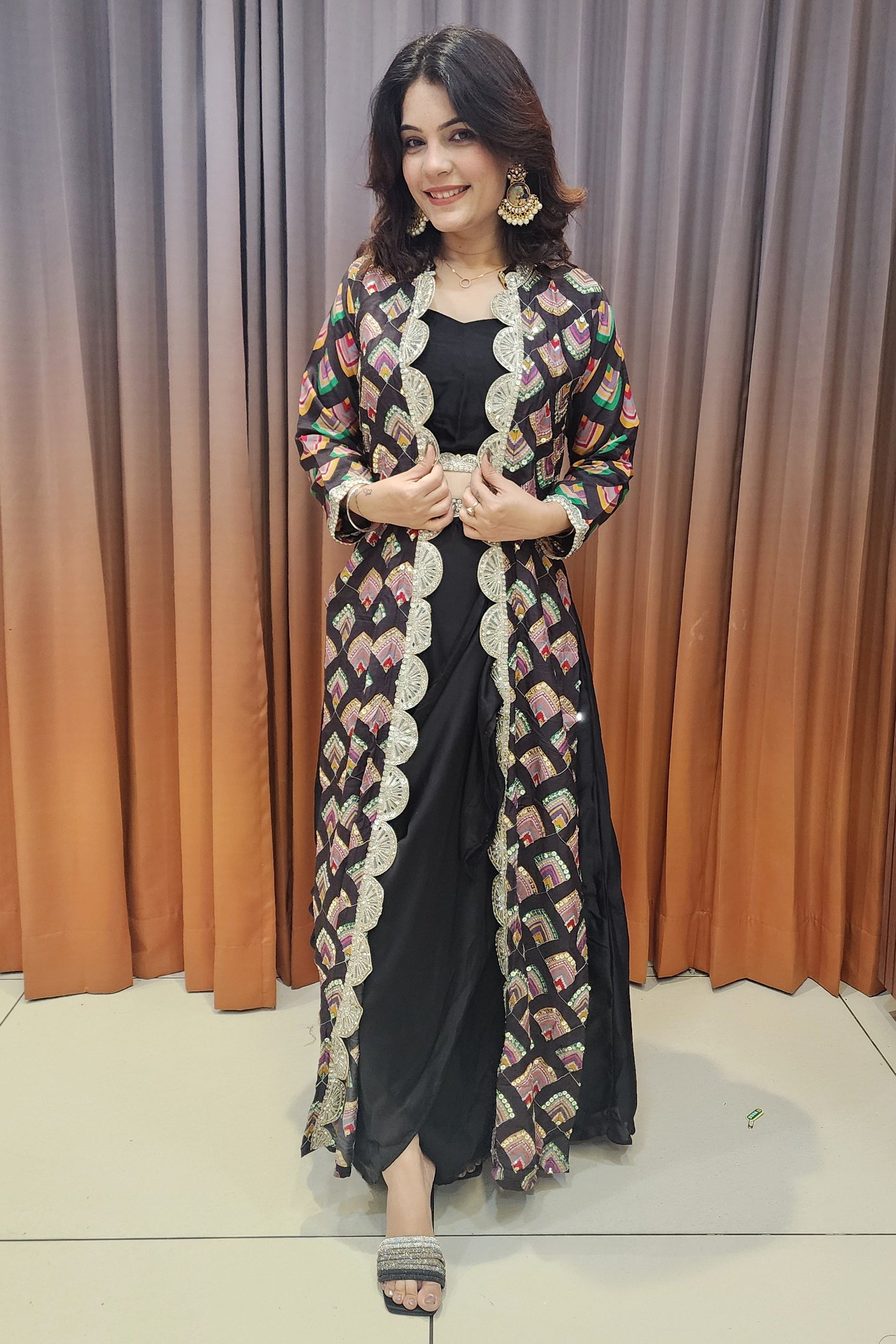 Grape Lover features a black draped dress paired with a vibrant printed long jacket, detailed borders, and statement earrings perfect for festive evenings, parties, and elegant Indo-Western styling with flair.