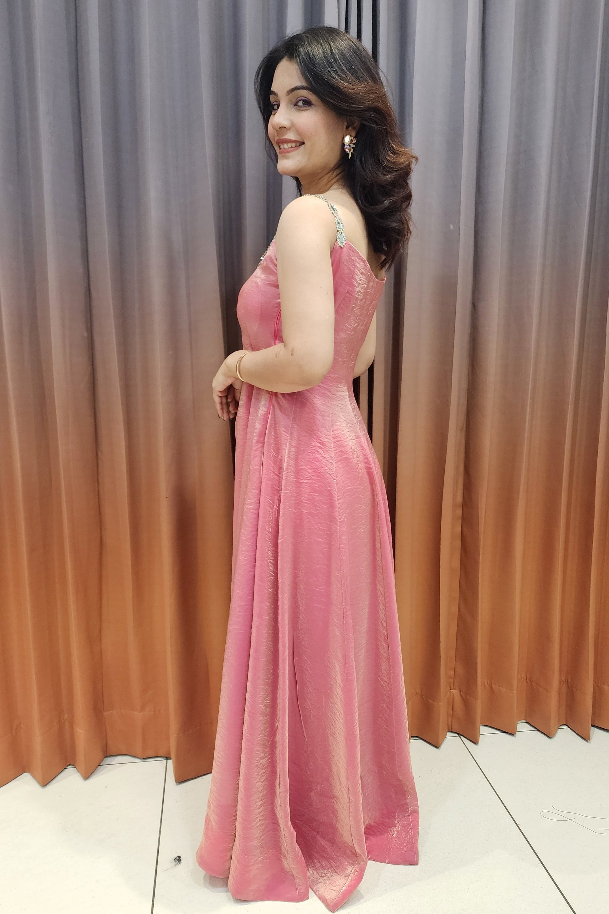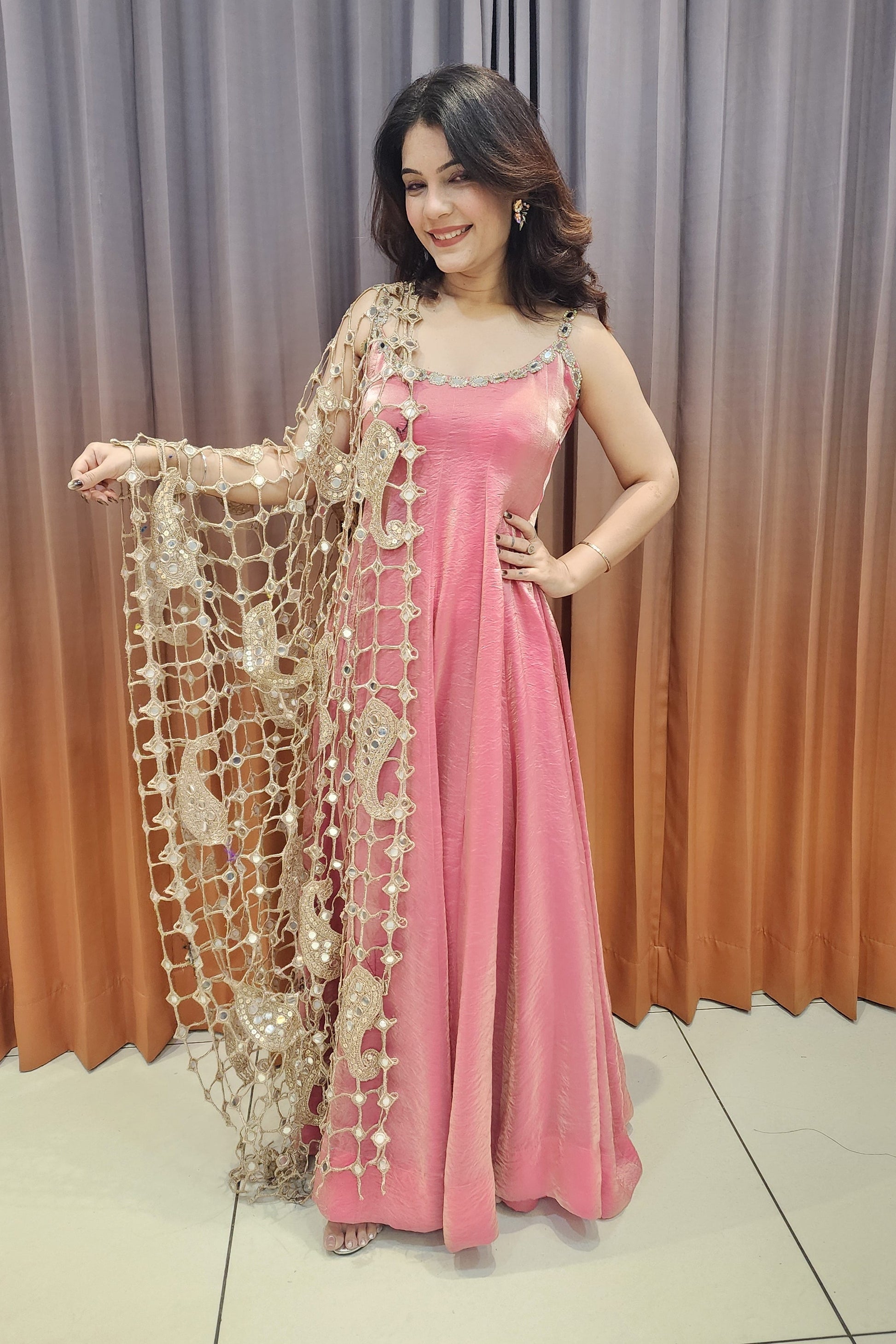 Imported Poshida features a blush pink flowy gown paired with an intricately embellished golden net dupatta, offering elegant shine, graceful movement, and a perfect choice for weddings, receptions, and festive celebrations.
