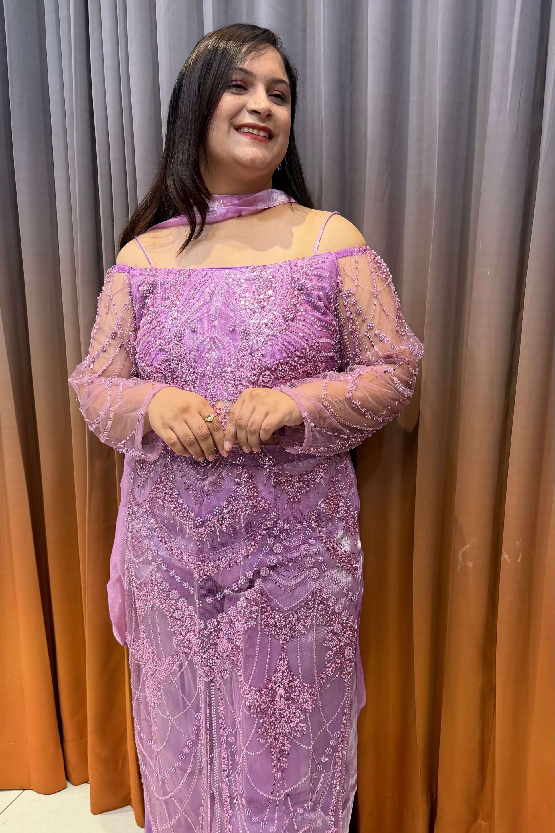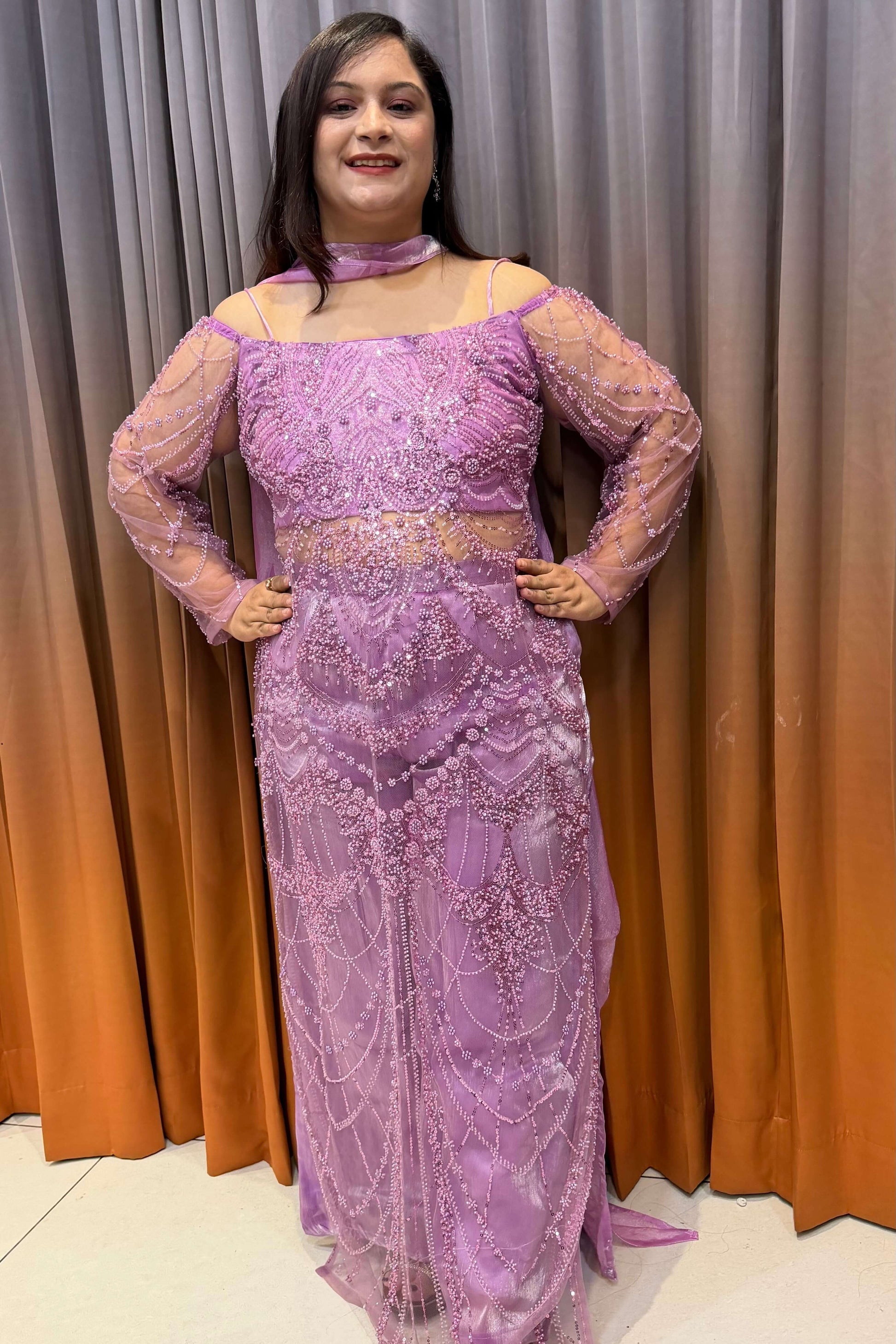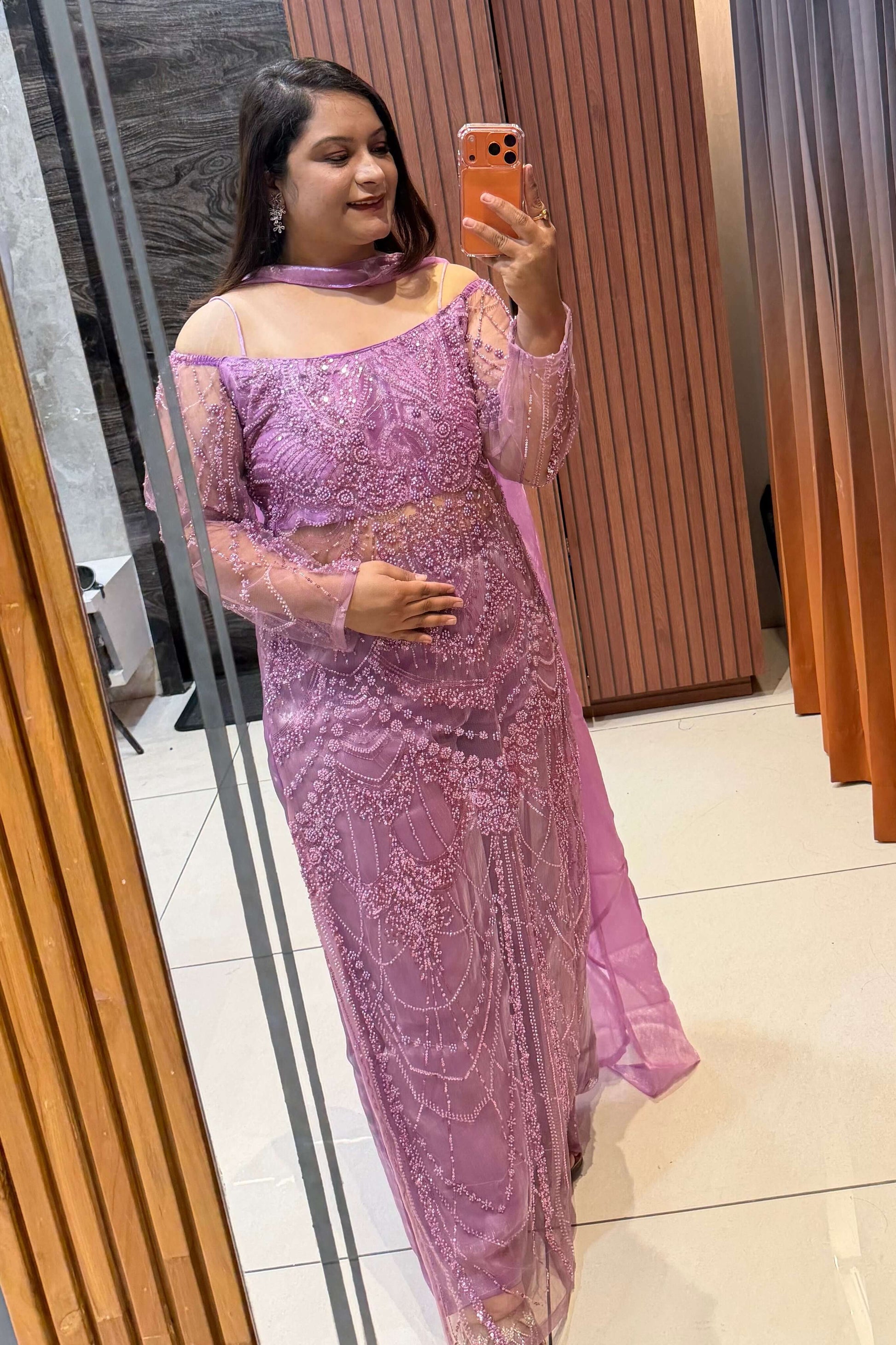 “A beautifully hand-embellished gown featuring intricate beadwork, sheer sleeves, and a graceful lavender hue. Perfect for festive events and parties, offering a delicate, elegant, and richly detailed Indo-western charm.”