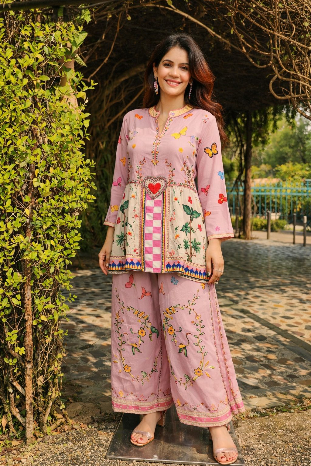 Charming blush pink co-ord set featuring delicate floral, butterfly, and heritage-inspired prints. Flowy kurta with statement panel detailing paired with wide-leg palazzo pants, perfect for summer brunches and festive day outings.