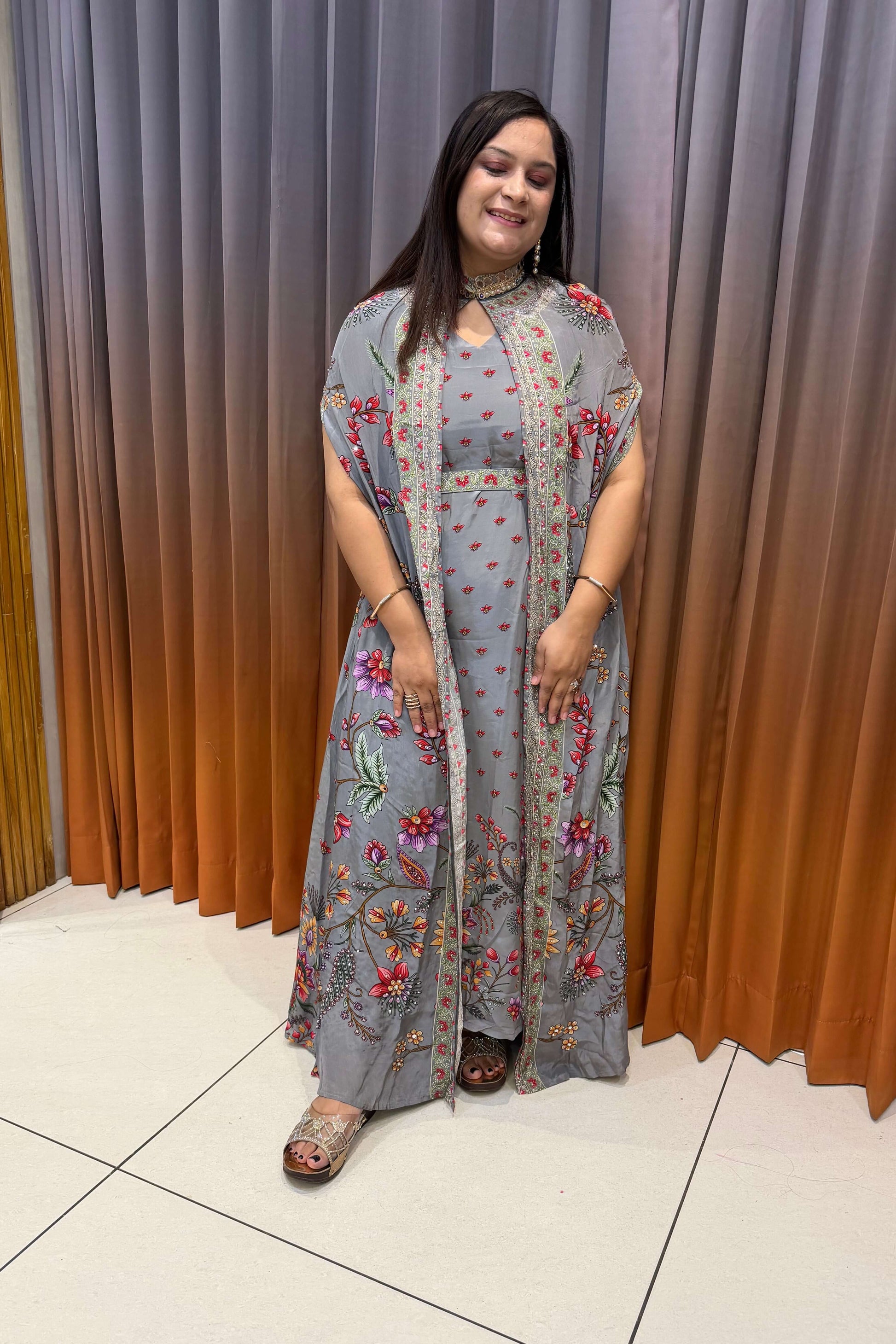 A graceful kaftan shrug set featuring intricate multicolor embroidery, soft flowy fabric, and a contemporary silhouette. Perfect for festive occasions, combining elegance, comfort, and effortless statement style.