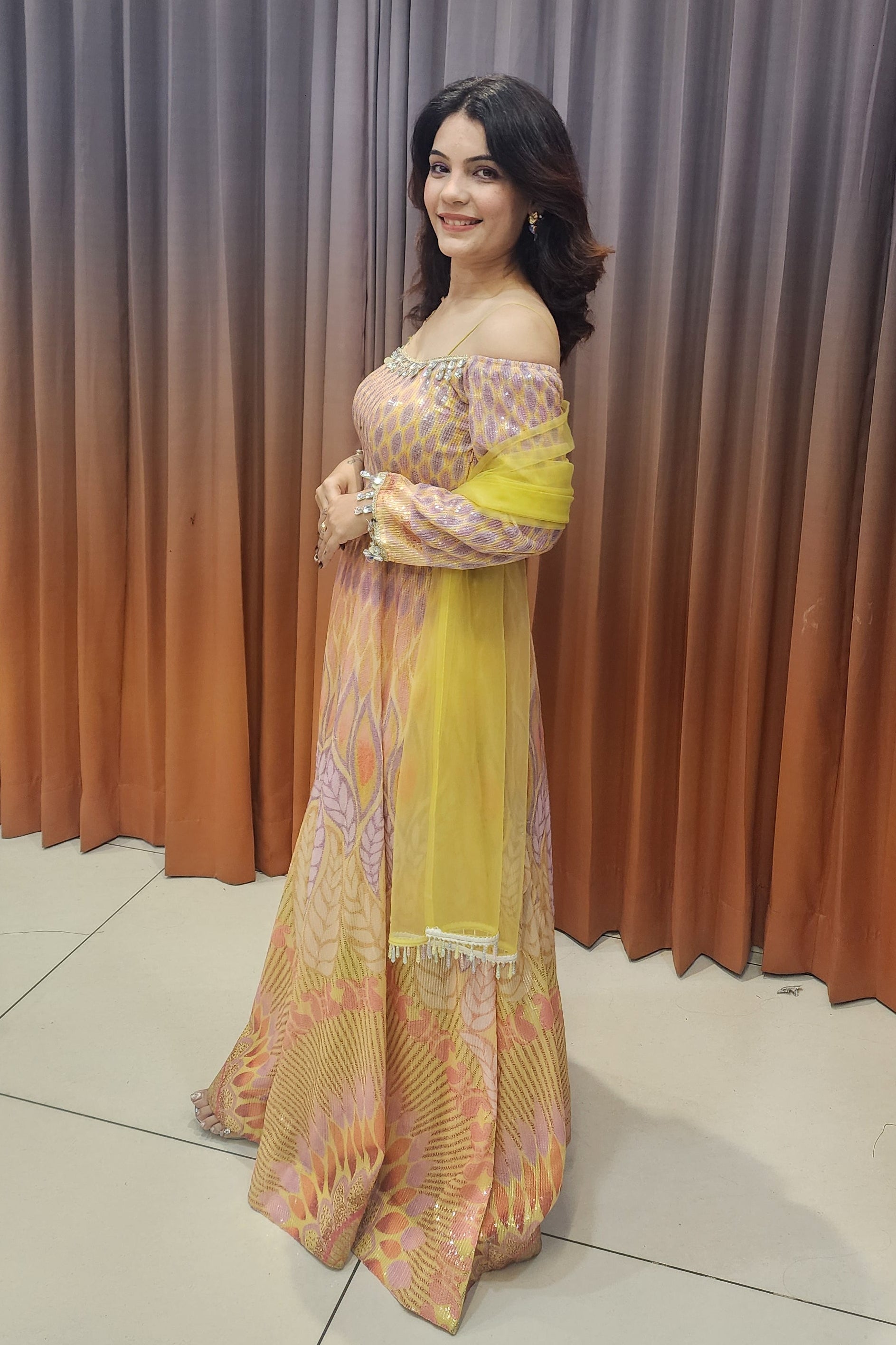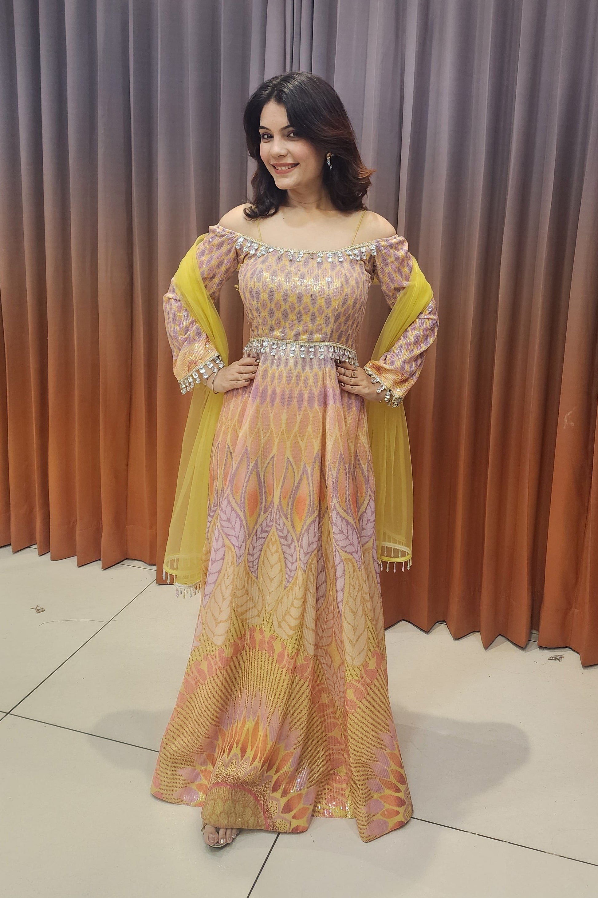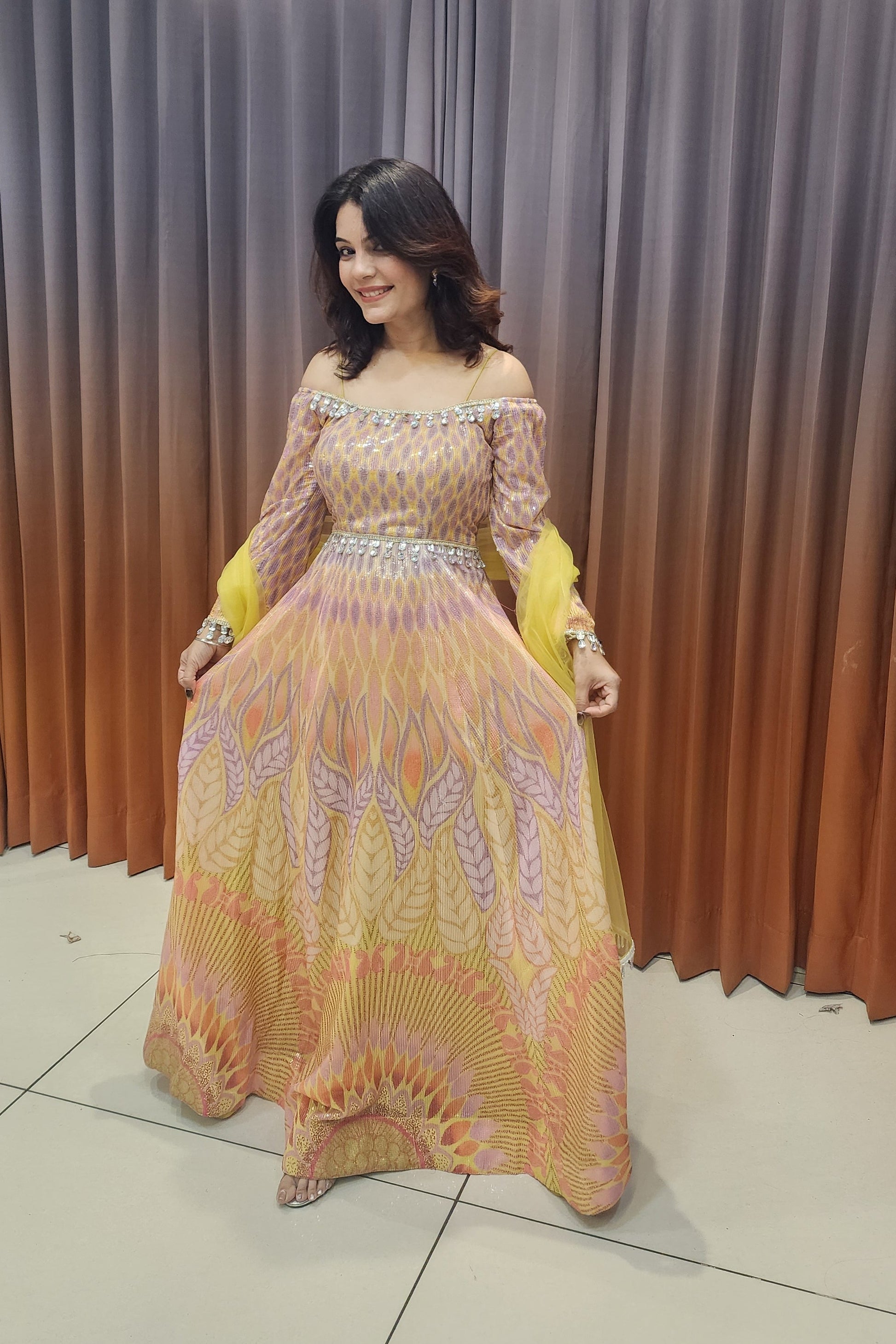 Mustard Carnivals features a vibrant mustard-toned printed gown with elegant off-shoulder detailing, shimmering accents, and a graceful flare—perfect for festive celebrations, daytime functions, and stylish ethnic occasions.