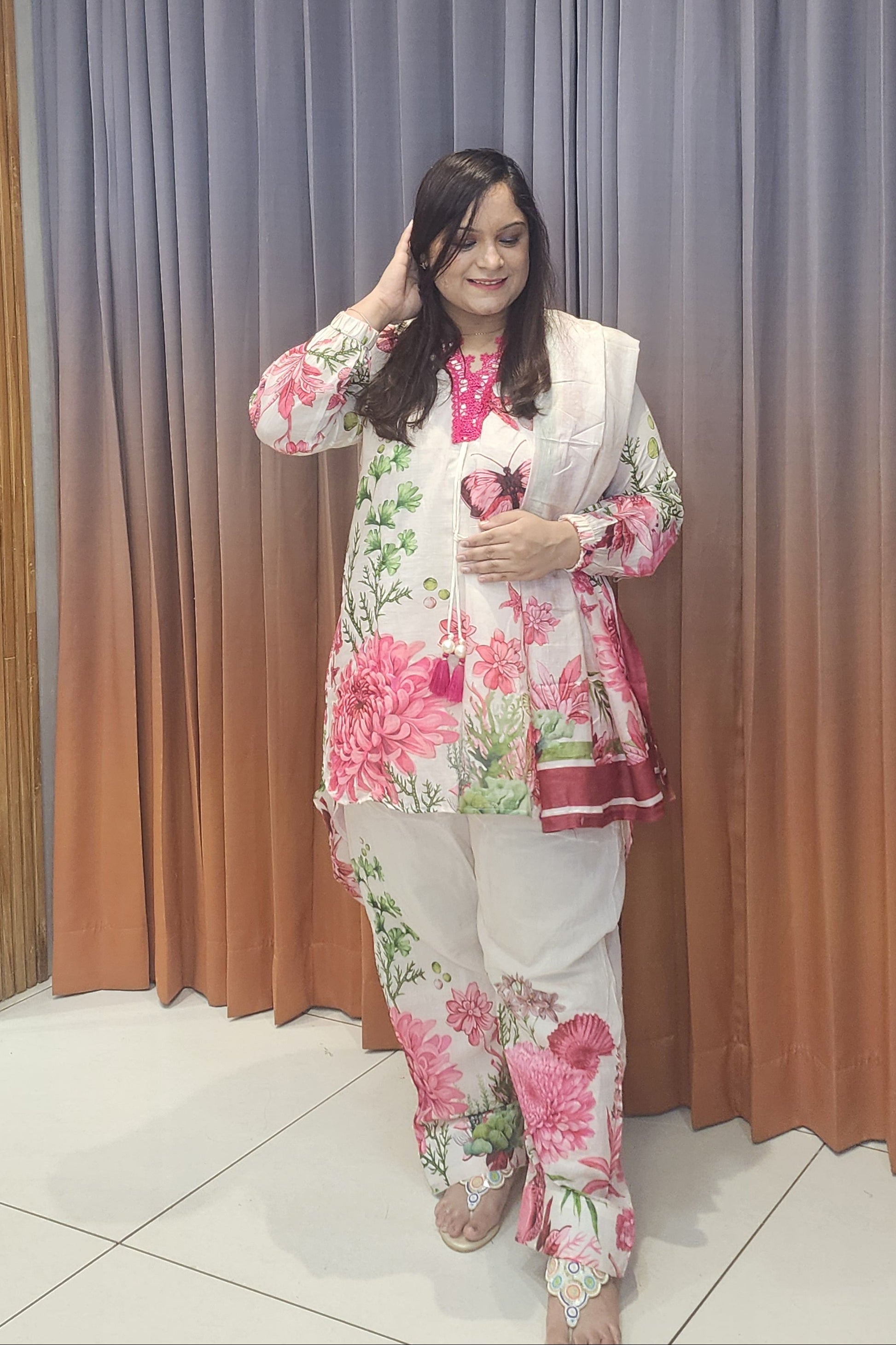 This multi Hakuba Farsi set showcases vibrant floral prints on a soft, flowy base, offering effortless elegance and comfort. Perfect for casual outings or festive moments, it blends freshness, style, and everyday sophistication.