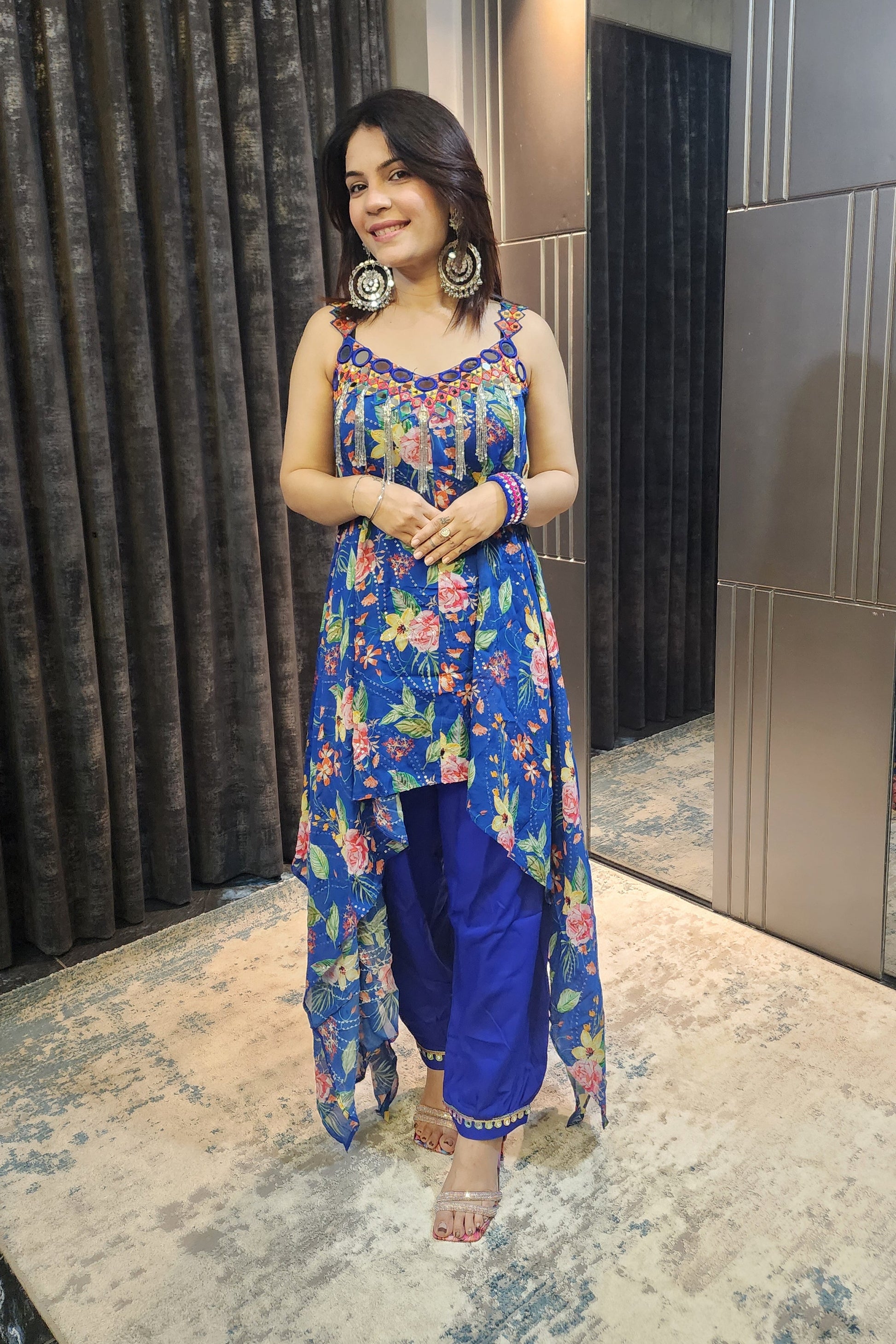 A vibrant blue fusion strap set featuring a worked-crepe asymmetrical floral top paired with soft pure-crepe plazo. Stylish, lightweight, and festive—perfect for parties, sangeet nights, and statement occasions.