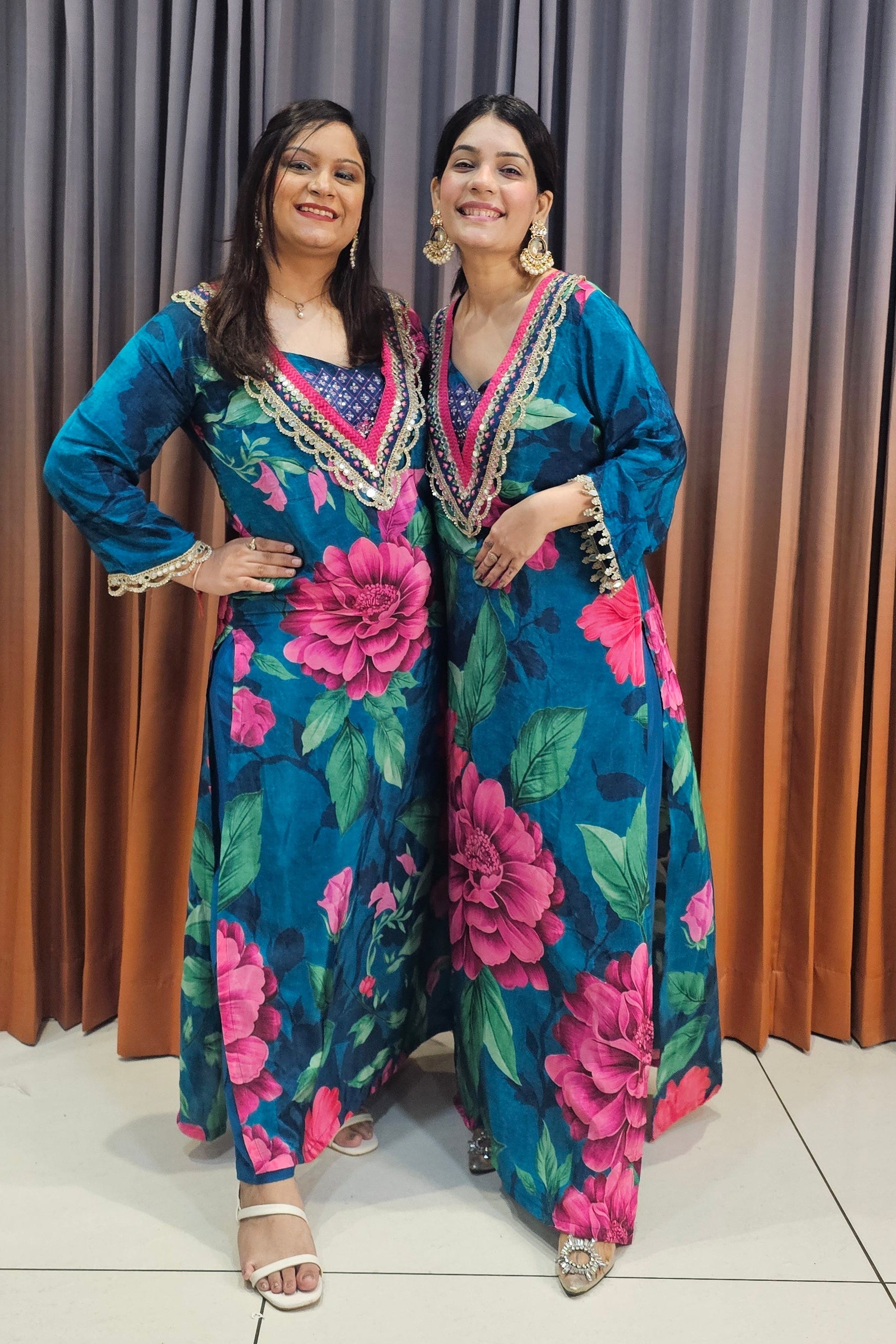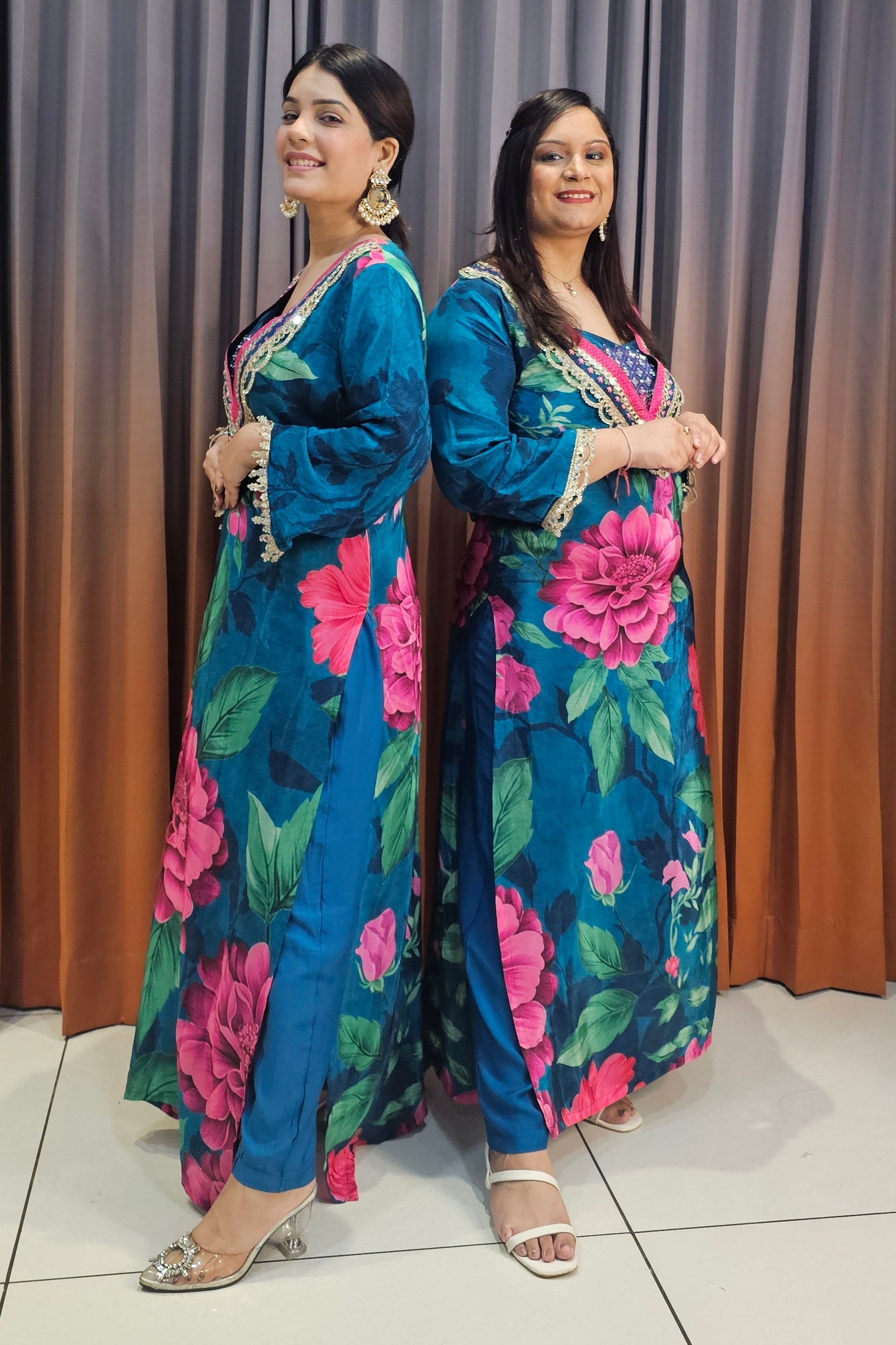 This vibrant 3PCS long set features bold floral prints and intricate neckline detailing, paired with a matching inner and dupatta. Its flowy silhouette offers elegant comfort, perfect for festive wear, gatherings, and stylish day outings.