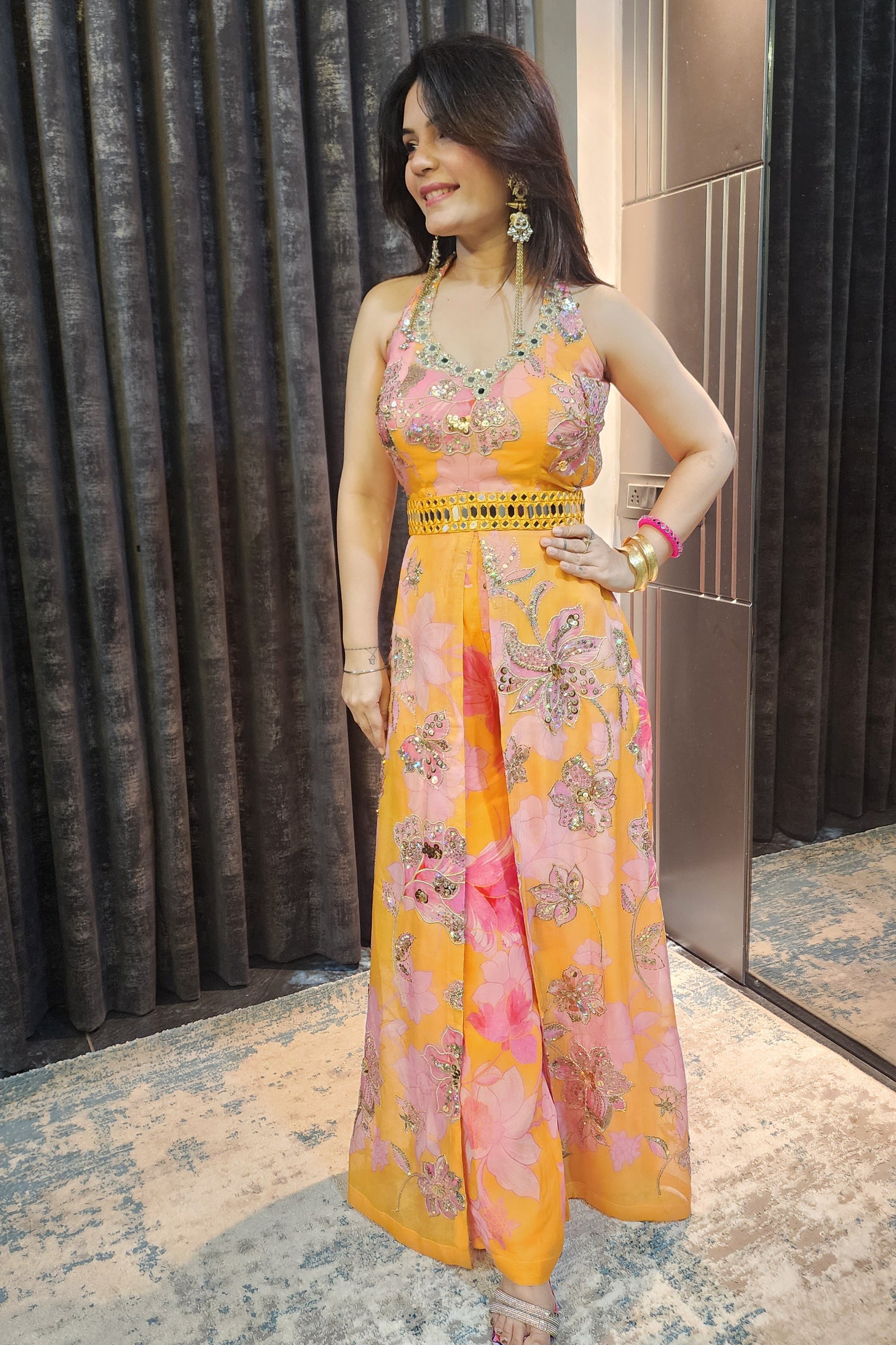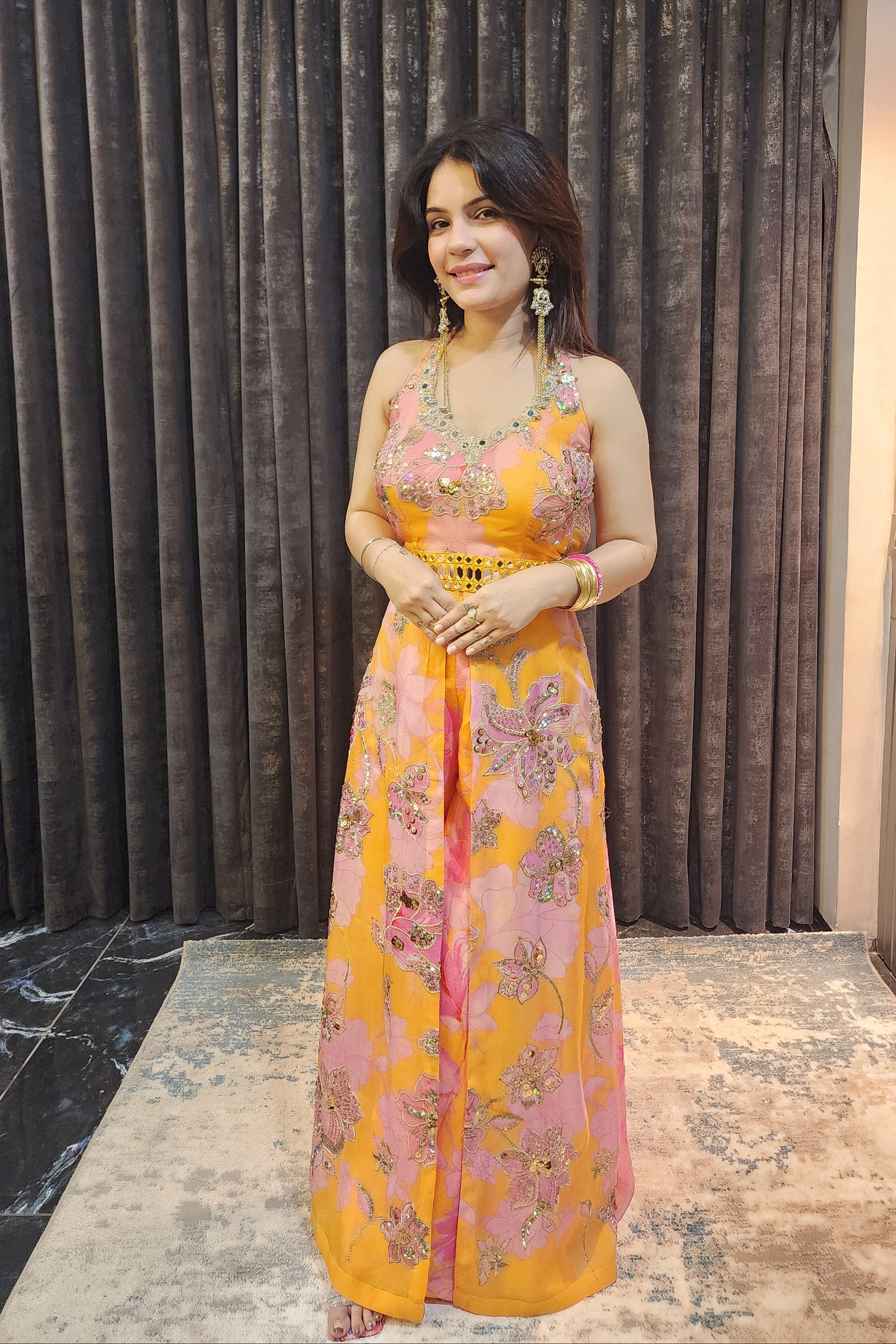 A vibrant yellow-pink floral slit dress adorned with mirror work, bead details, and an elegant fitted waist. Flowy, festive, and effortlessly royal—perfect for sangeet, mehendi, celebrations, and statement occasions.