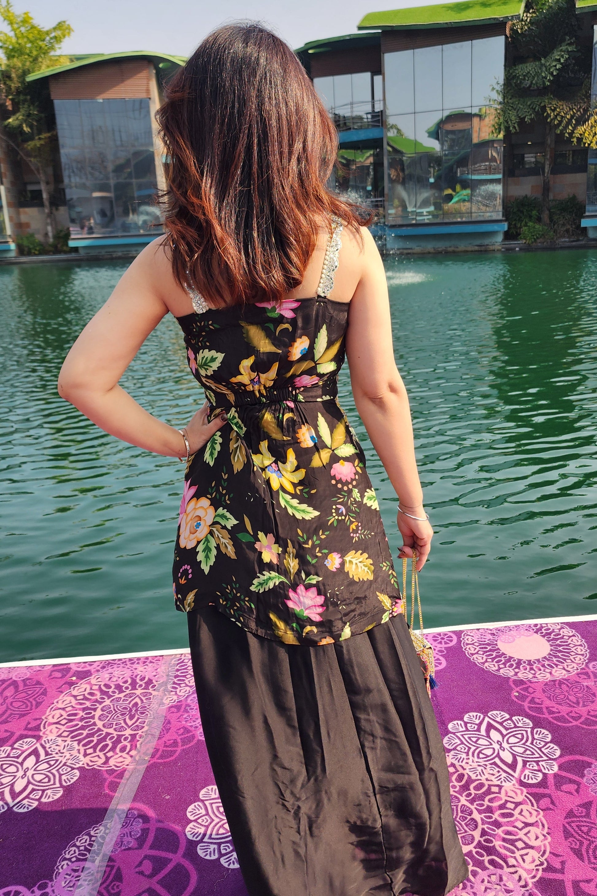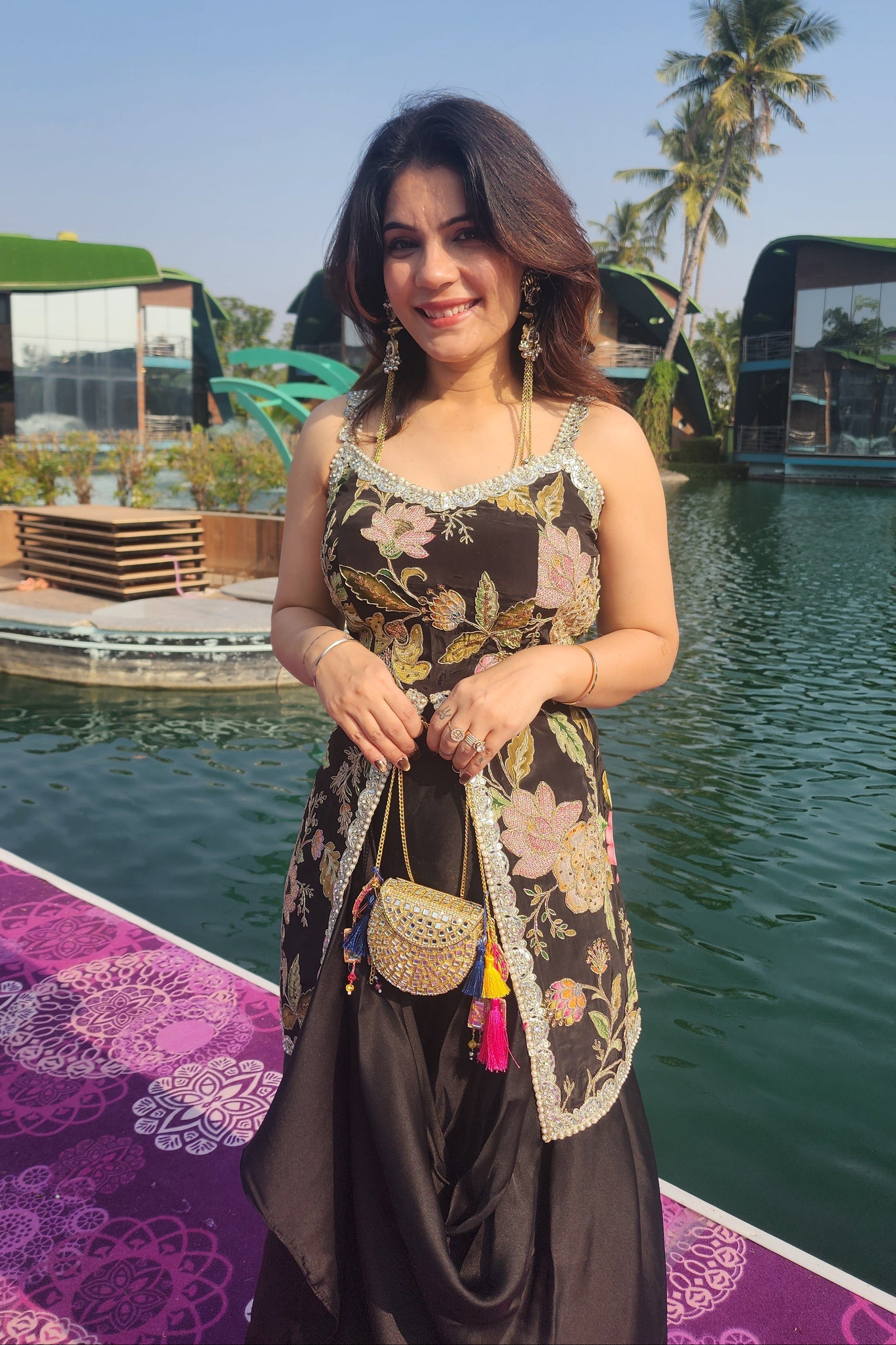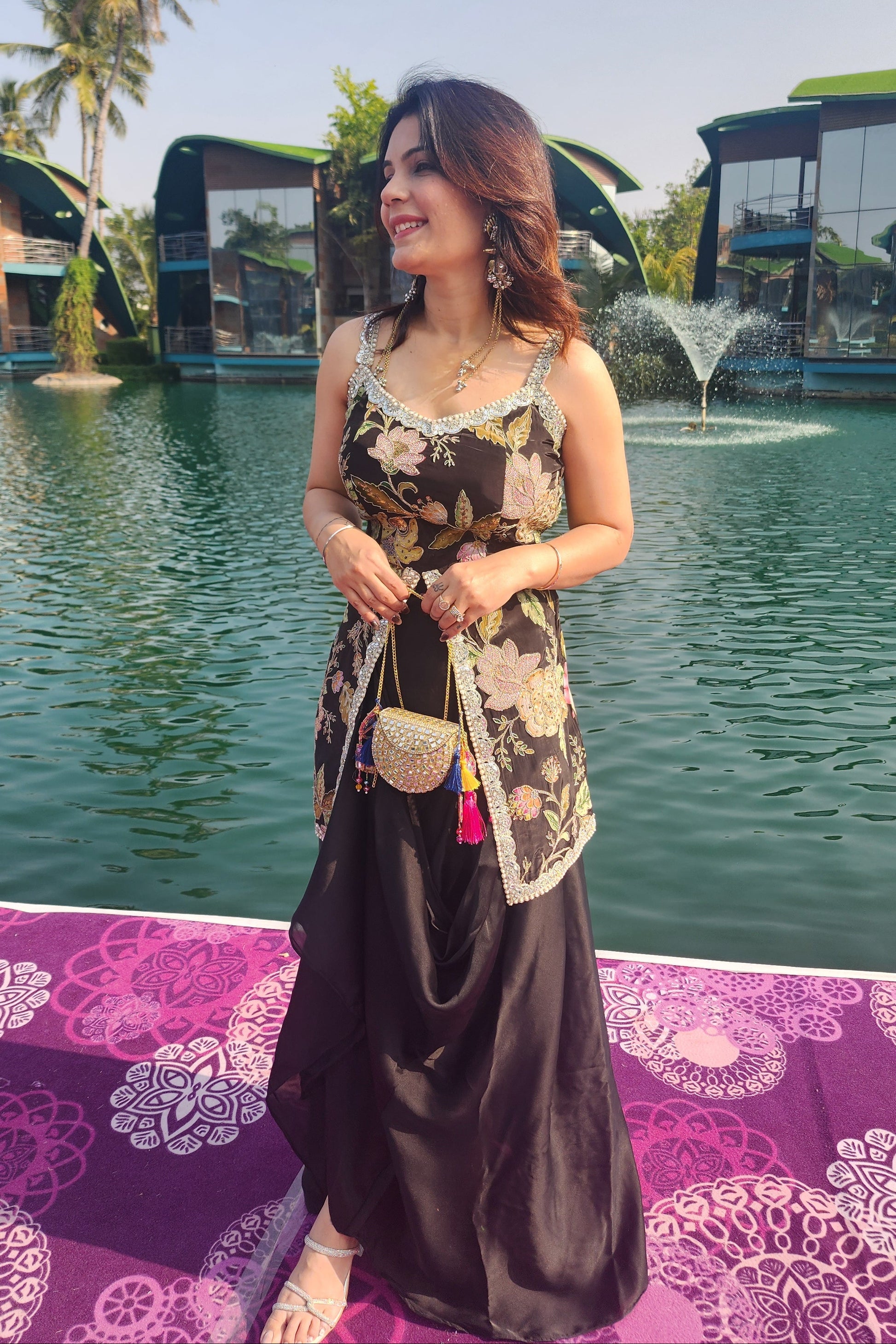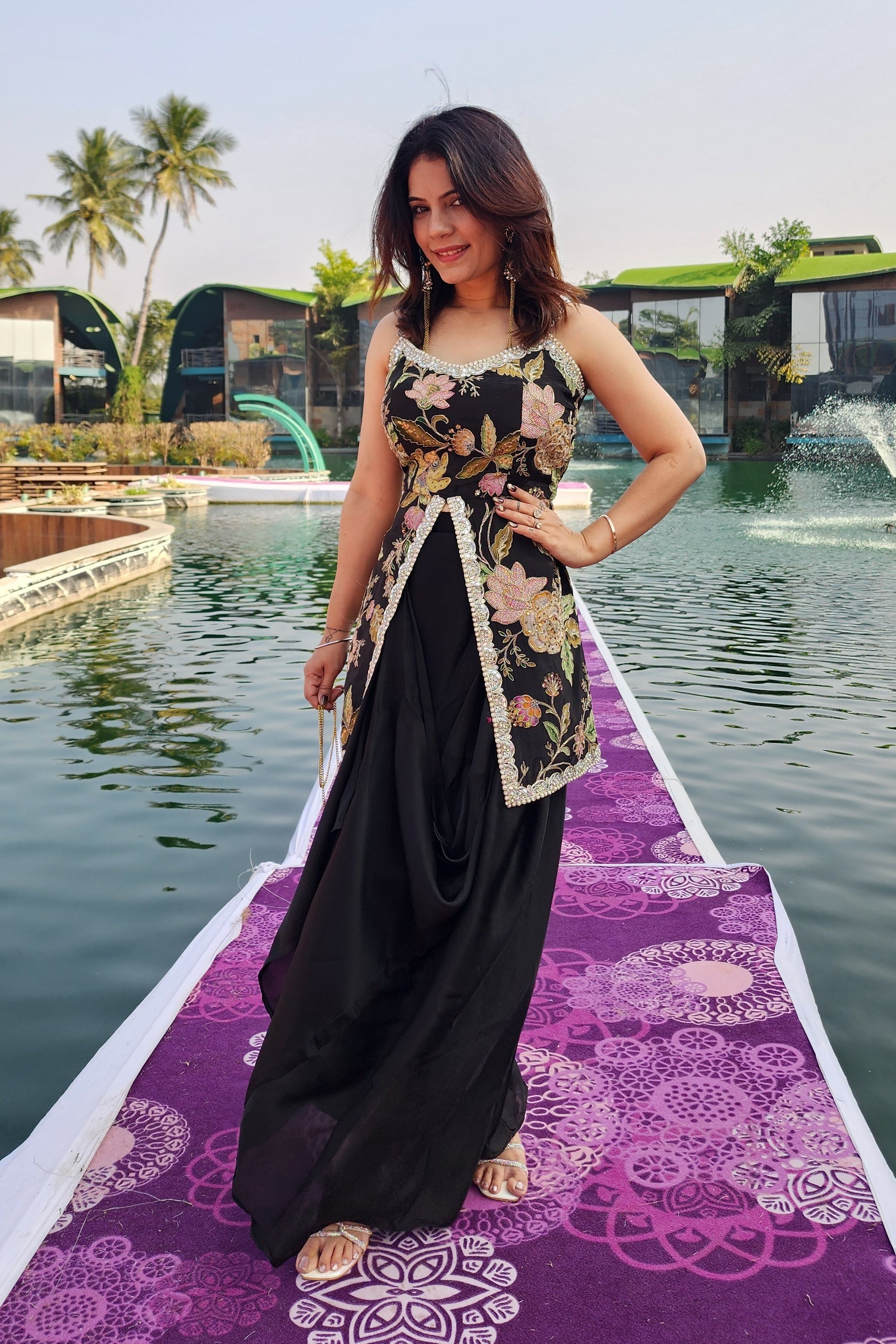 This Slit Beauty outfit features intricate floral embroidery, a shimmering neckline, and a stylish front-slit silhouette. Paired with graceful draped pants, it offers a modern festive look with effortless elegance.
