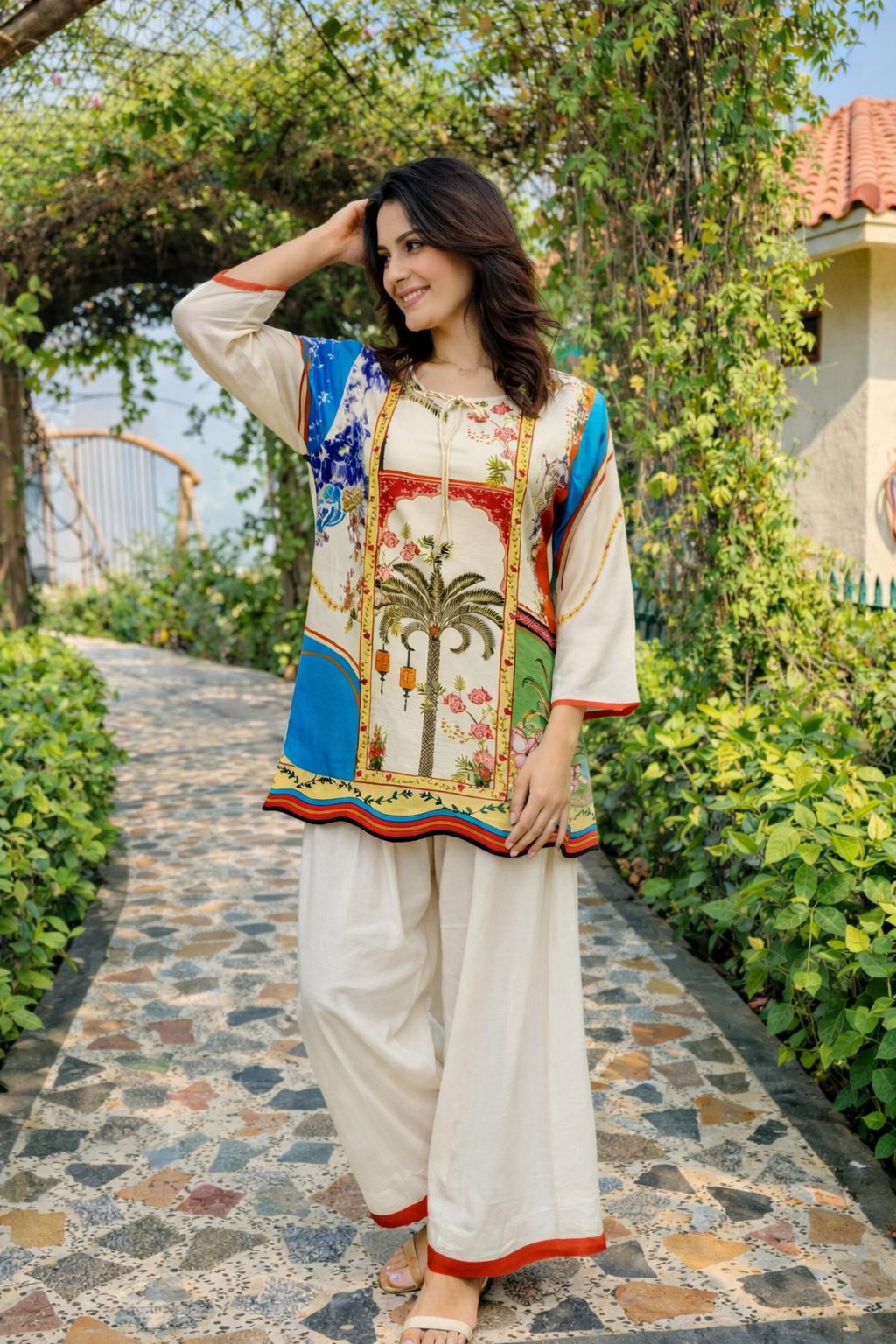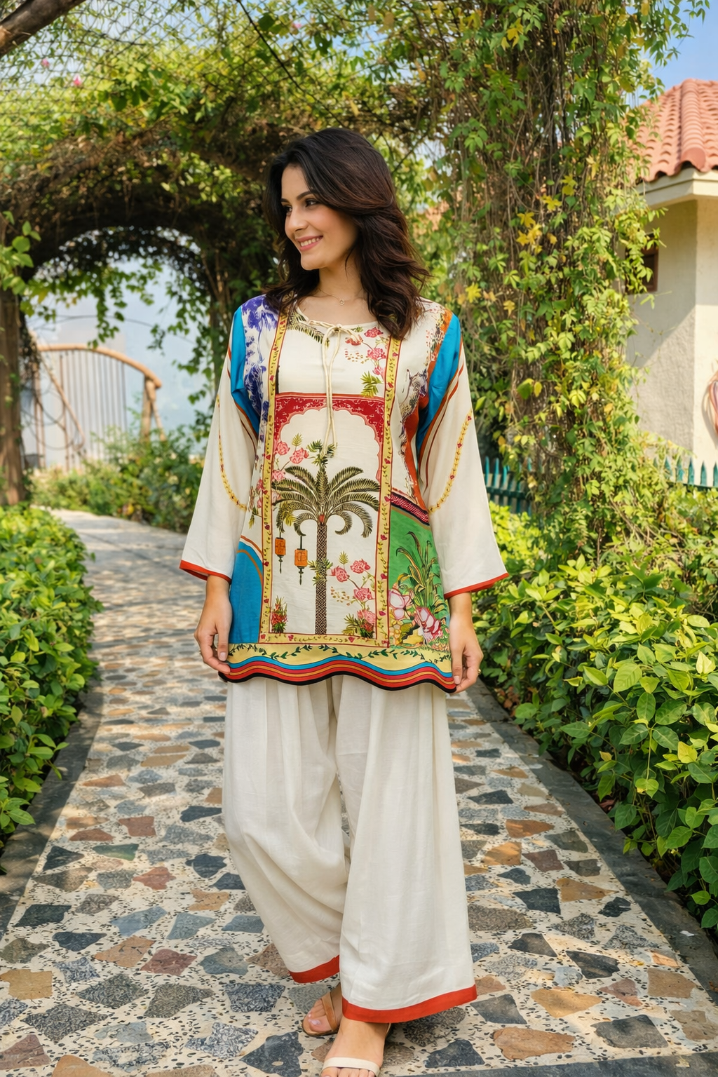 Elegant ivory kurta adorned with vibrant tropical and heritage-inspired prints, featuring colorful borders and statement detailing. Paired with flowy wide-leg palazzo pants, this breezy ensemble is perfect for summer outings and festive daywear.